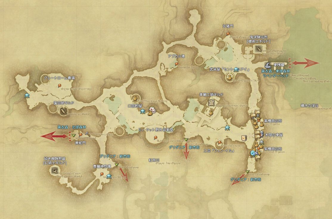 신시가지에 위치해 있는 것들은 에트라이트 광장, 쌍사당 총사령부, 여관, 궁술사길드, 목수길드가 위치해 있으며, 구 시가지에는 원예가 길드, 환술사 길드, 창술사 길드, 가죽공예가 길드가 있습니다. 오히려 신 시가지에 좀 더 한산한편인데 이는 거의 모든 축제들은 구 시가지의 '미 케토 야외 음악당'에서 진행되고 있으며, 아프칼루 폭포 또한 구시가지에 위치하고 있습니다.