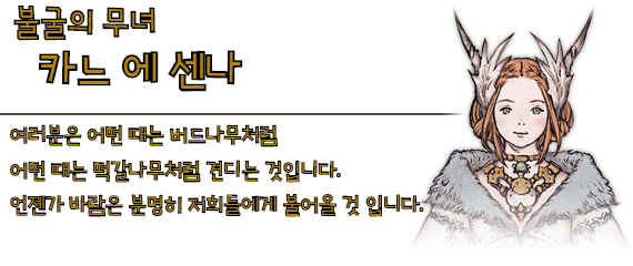 카느 에 센나는 그리다니아의 대표자이며 국시를 점치는 3명의 대신관 중 한명입니다. 또한 국권의 최고 기관인 '정령평의회'의 의장을 역임하고 있습니다.